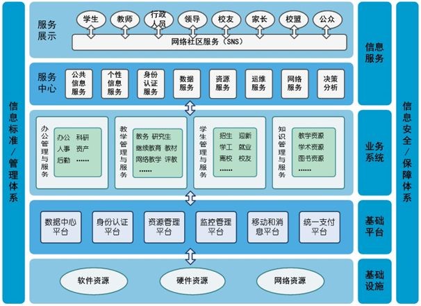 智慧校園的三個(gè)核心的特征:一是為廣大師生提供一個(gè)全面的智能感知環(huán)境和綜合信息服務(wù)平臺(tái),提供基于角色的個(gè)性化定制服務(wù);二是將基于計(jì)算機(jī)網(wǎng)絡(luò)的信息服務(wù)融入學(xué)校的各個(gè)應(yīng)用與服務(wù)領(lǐng)域,實(shí)現(xiàn)互聯(lián)和協(xié)作;三是通過智能感知環(huán)境和綜合信息服務(wù)平臺(tái),為學(xué)校與外部世界提供一個(gè)相互交流和相互感知的接口。