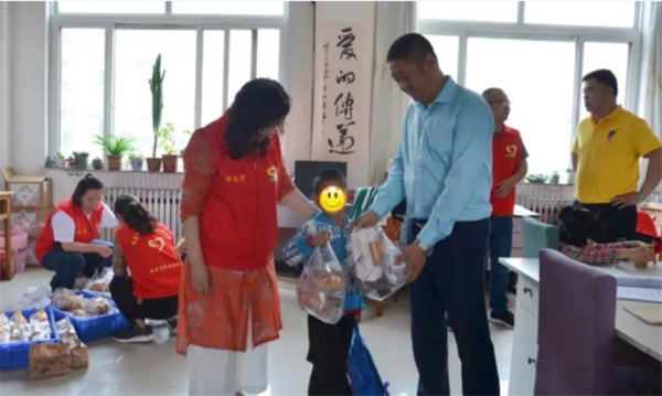 陳紅林校長與棲霞愛的傳遞助學(xué)協(xié)會五星級慈善志愿者徐建華女士為孩子發(fā)放面包