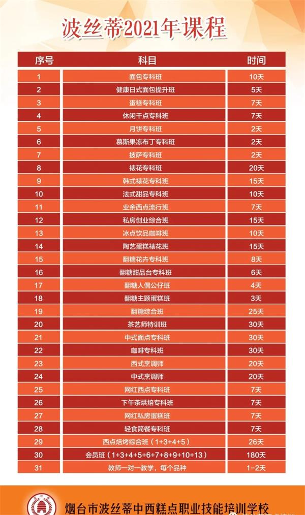 煙臺市波絲蒂中西糕點(diǎn)職業(yè)技能培訓(xùn)學(xué)校創(chuàng)立于2004年,是中西糕點(diǎn)專業(yè)培訓(xùn)機(jī)構(gòu),是煙臺市人力資源和社會保障局指定的正規(guī)技能培訓(xùn)基地,大學(xué)生及再就業(yè)人員職業(yè)技能培訓(xùn)基地,煙臺市金藍(lán)領(lǐng)高技能人才培訓(xùn)基地。西點(diǎn)課程設(shè)置全面:面包專科班、蛋糕??瓢?、休閑干點(diǎn)班、月餅??瓢?、披薩專科班、裱花??瓢唷⒎ㄊ教鹌穼?瓢?、韓式裱花班、休閑飲品咖啡班、健康日式面包提升班、私房創(chuàng)業(yè)綜合班、業(yè)余西點(diǎn)流行班等等。