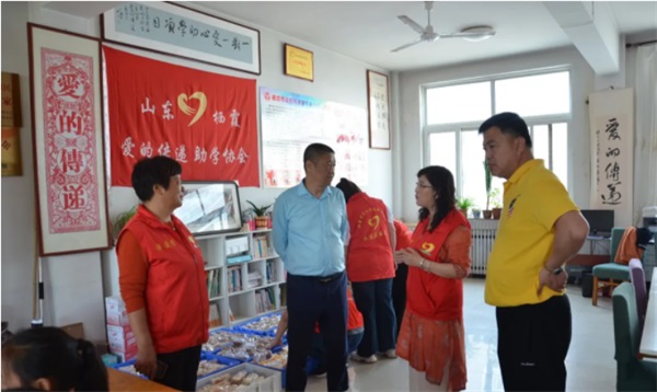 陳校長(右一)、崔主任(左一)與棲霞愛的傳遞助學(xué)協(xié)會的志愿者