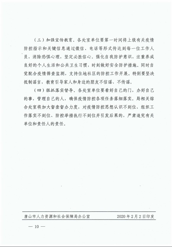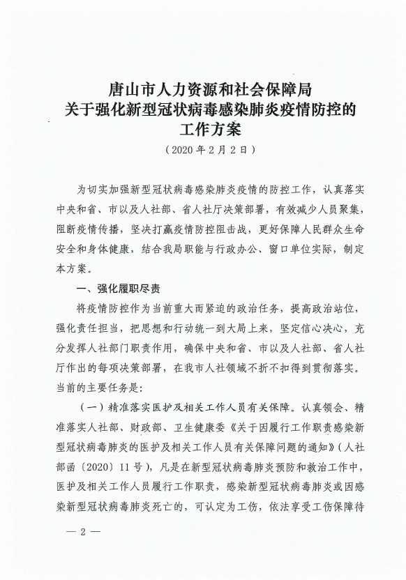 唐山市人社局關(guān)于印發(fā)《強(qiáng)化新型冠狀病毒感染的肺炎疫情防控的工作方案》的通知