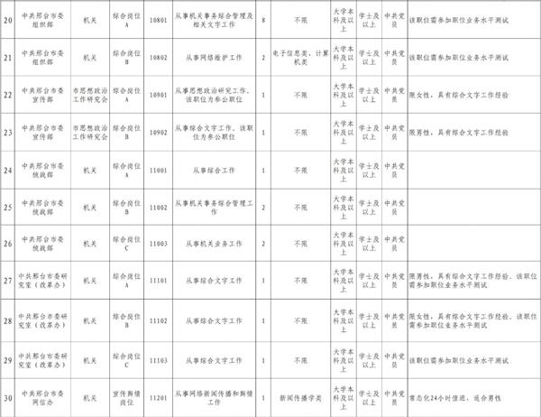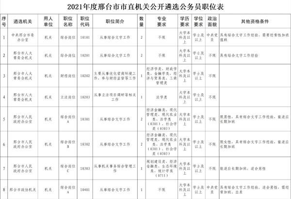 詳見附件1《2021年度邢臺市市直機關(guān)公開遴選公務(wù)員職位表》(以下簡稱《職位表》)。