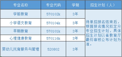 學(xué)校堅(jiān)持以人為本的辦學(xué)理念,落實(shí)立德樹人根本任務(wù),形成了以“學(xué)前教育為主,小學(xué)教育、早期教育、藝術(shù)教育為輔,兒童發(fā)展相關(guān)專業(yè)為支撐,社會(huì)服務(wù)類專業(yè)為補(bǔ)充”的學(xué)科專業(yè)架構(gòu)體系,設(shè)有學(xué)前教育、早期教育、小學(xué)語(yǔ)文教育、小學(xué)數(shù)學(xué)教育、心理健康教育、音樂(lè)教育、體育教育、美術(shù)教育、嬰幼兒托育服務(wù)與管理等專業(yè)。