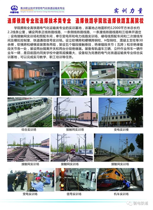 衡水職業(yè)技術(shù)學(xué)院電氣化鐵道運(yùn)輸類專業(yè)是學(xué)院與中國中鐵深入校企合作、產(chǎn)教融合共建特色專業(yè),打造鐵路和軌道交通行業(yè)“文化素質(zhì)+職業(yè)技能”的新型大學(xué)生人才培養(yǎng)模式,是全國鐵路企業(yè)舉辦的電氣化鐵道運(yùn)輸類專業(yè)的國家級(jí)重點(diǎn)職業(yè)院校,是國家電氣化鐵道運(yùn)輸類和地鐵行業(yè)后備力量的主要來源,是中國電氣化鐵道運(yùn)輸類高技能人才培養(yǎng)基地。學(xué)院下設(shè)"鐵道供電技術(shù)”、“鐵道信號(hào)自動(dòng)控制"、城市軌道交通運(yùn)營管理"、“鐵道機(jī)車運(yùn)用與維護(hù)”專業(yè),具備了全日制大專學(xué)生的培養(yǎng)資格,打造鐵路及軌道交通行業(yè)"文化素質(zhì)+職業(yè)技能"的新型大學(xué)生人才培養(yǎng)模式,突出   "應(yīng)用"  與  "技能"兩個(gè)特點(diǎn),在提高大學(xué)生文化素質(zhì)的基礎(chǔ)上,運(yùn)用學(xué)校雄厚師資和全真鐵路"四電"及運(yùn)輸專業(yè)綜合實(shí)訓(xùn)基地開展“真刀真槍"的實(shí)訓(xùn)課程.使培養(yǎng)出來的大學(xué)生不是只懂理論知識(shí)的花瓶,而是成為I正掌握實(shí)際操作技能的優(yōu)秀者。