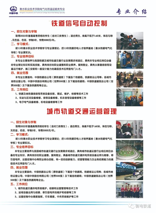 1、 中鐵直屬:衡水職業(yè)技術(shù)學(xué)院電氣化鐵道運(yùn)輸類專業(yè)是與中國中鐵總公司深入校企合作,產(chǎn)教融合,以培養(yǎng)高技能電氣化鐵路及軌道交通人才為主的公辦職業(yè)院校。辦學(xué)綜合能力強(qiáng),信譽(yù)可靠,認(rèn)可度高。